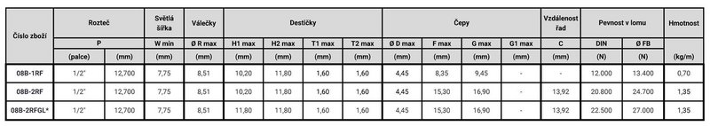 Nerezové válečkové řetězy 08B-RF, vyráběné podle ISO 606, mají rozteč 12,7 mm (1/2"). Existují s projmutými destičkami jako simplex (08B-1RF) a duplex (08B-2RF) a také s rovnými destičkami jako duplex (08B-2RFGL).