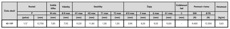 Válečkové řetězy 40-1RF nerezové oceli, vyráběné podle ANSI b 29.1, mají rozteč 12,7 mm (1/2"). Existují v provedení simplex.