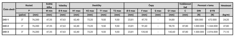Válečkové řetězy 240, vyráběné podle ANSI b 29.1, DIN8188, mají rozteč 76,20 mm (3"). Existují v provedení simplex (240-1), duplex (240-2) a triplex (240-3).