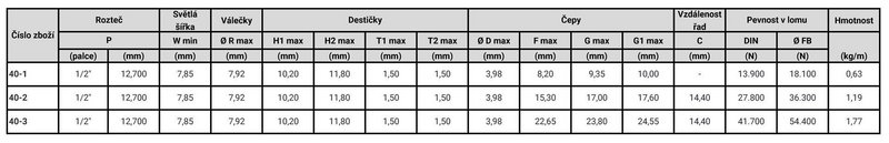Válečkové řetězy 40, vyráběné podle ANSI b 29.1, mají rozteč 12,7 mm (1/2"). Existují v provedení simplex (40-1), duplex (40-2) a triplex (40-3).
