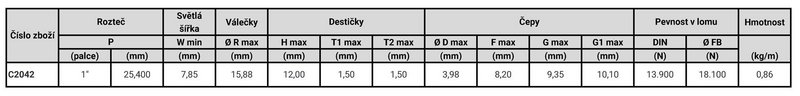 Válečkové řetězy s dlouhými články C2042, vyráběné podle ISO 1275, mají rozteč 25,40 mm (1").