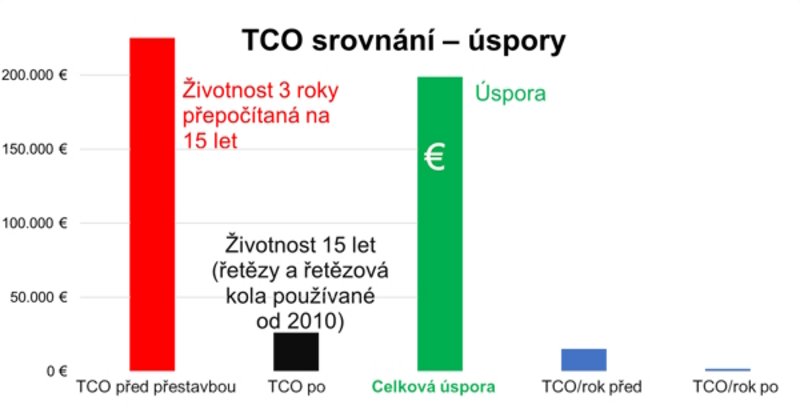 Náklady na nové řetězy – válečkové řetězy, dělená řetězová kola a úchytné body – byly o něco nižší než u článkových řetězů.